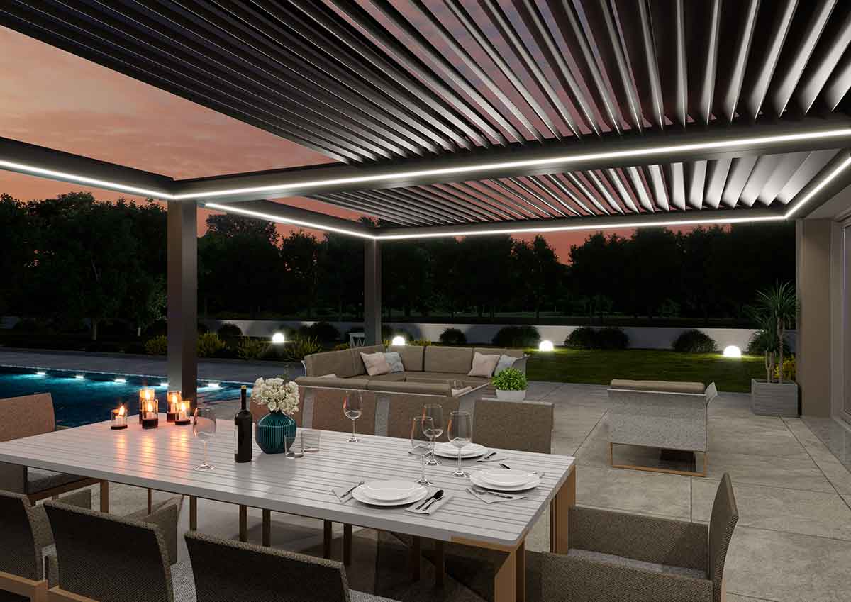 Una pergola bioclimatica retraibile, autoportante/addossata o senza piantane dal design moderno, con lamelle impacchettabili per regolare luce e temperatura e gronda integrata per un efficace smaltimento dell’acqua piovana. Personalizzabile con luci LED e chiusure perimetrali.