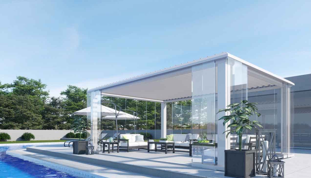 Pergola bioclimatica autoportante in alluminio con design innovativo e sistema scorrevole tuttovetro esterno per un effetto “House of Glass”. Gronda perimetrale con scarico acqua integrato nei montanti. Lamelle in alluminio orientabili da 0° a 140° con guarnizioni e scarico acqua laterale per protezione solare, climatizzazione e riparo dalla pioggia.