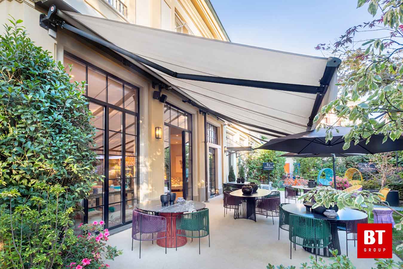 La tenda da esterno a bracci è un modello premontato su barra quadra 40×40 mm, con bracci a pantografo.