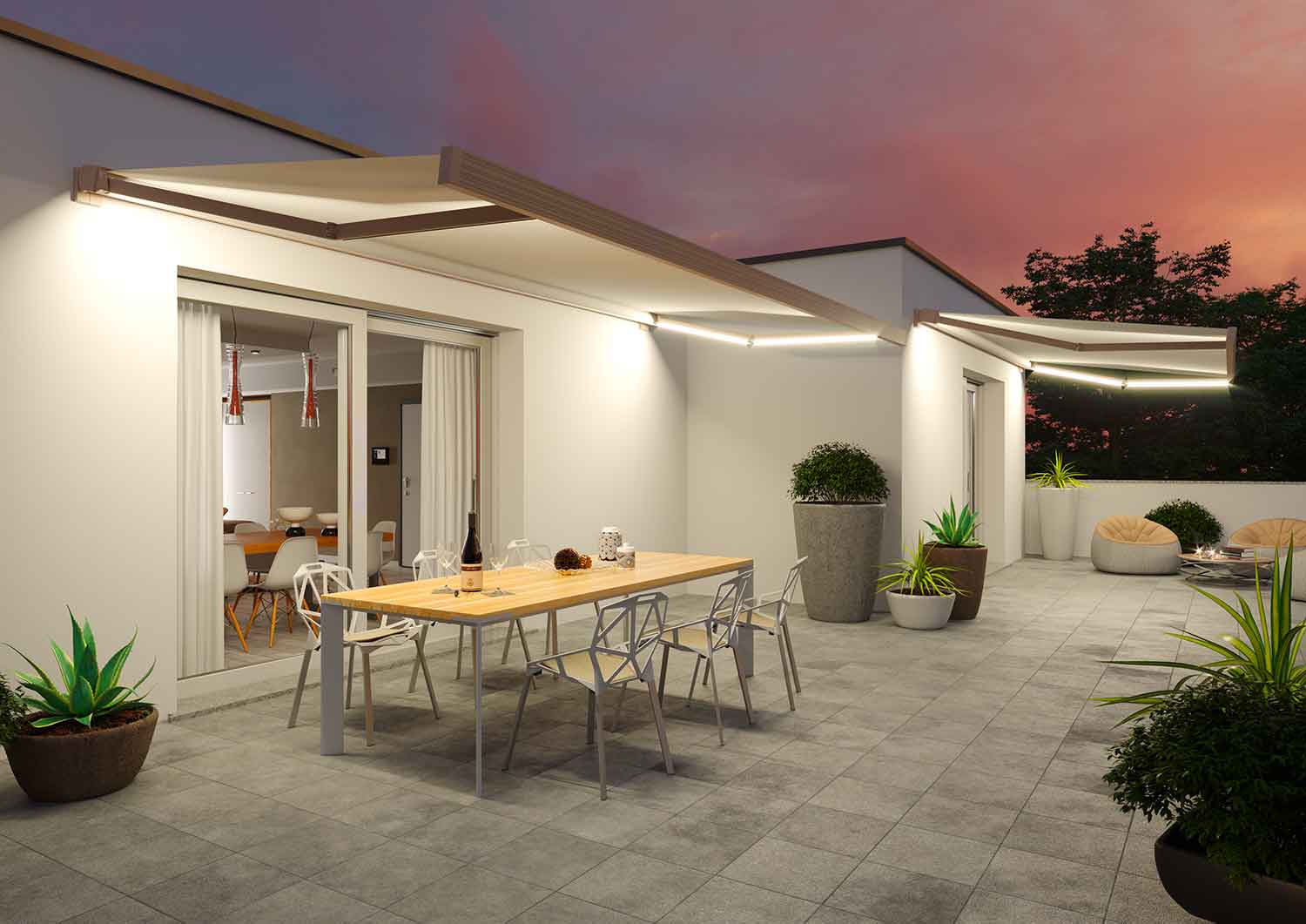 Tenda motorizzata con cassonetto a scomparsa totale per protezione di telo e struttura, design compatto per balconi con altezze ridotte. Attacco a soffitto/parete, luci LED integrate. Design effetto pietra depositato, verniciatura a polveri, viteria inox a vista.